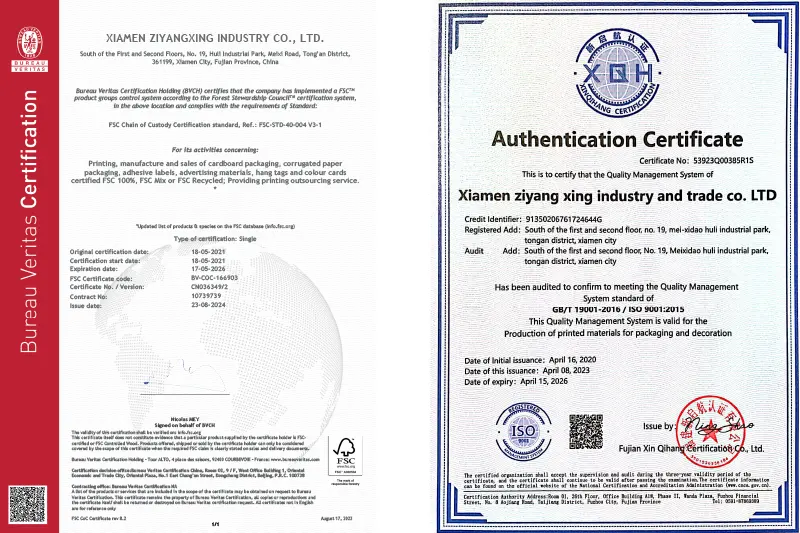A: 우리는 FSC, FDA, SGS, VOC를 보유하고 있으며 RoHS, 94/62/EC 및 US TPCH와 같은 환경 규정을 준수합니다. 우리 공장은 선도적인 국제 포장 공급업체이자 수출업체로서 ISO9001 인증을 받았습니다.